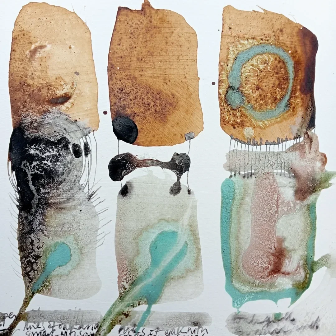 Elizabeth uses oil-based inks to hand-burnish collagraphs, as well as various frottage and direct printing methods, similar to the Japanese Gyotaku method.